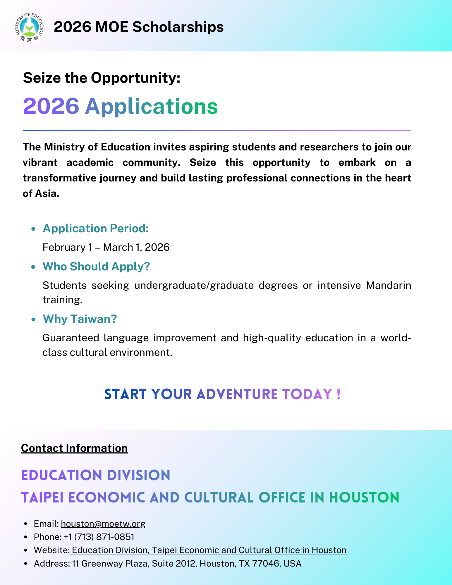 For application guidelines and more information, please contact the Education Division of the Taipei Economic and Cultural Office in Houston: