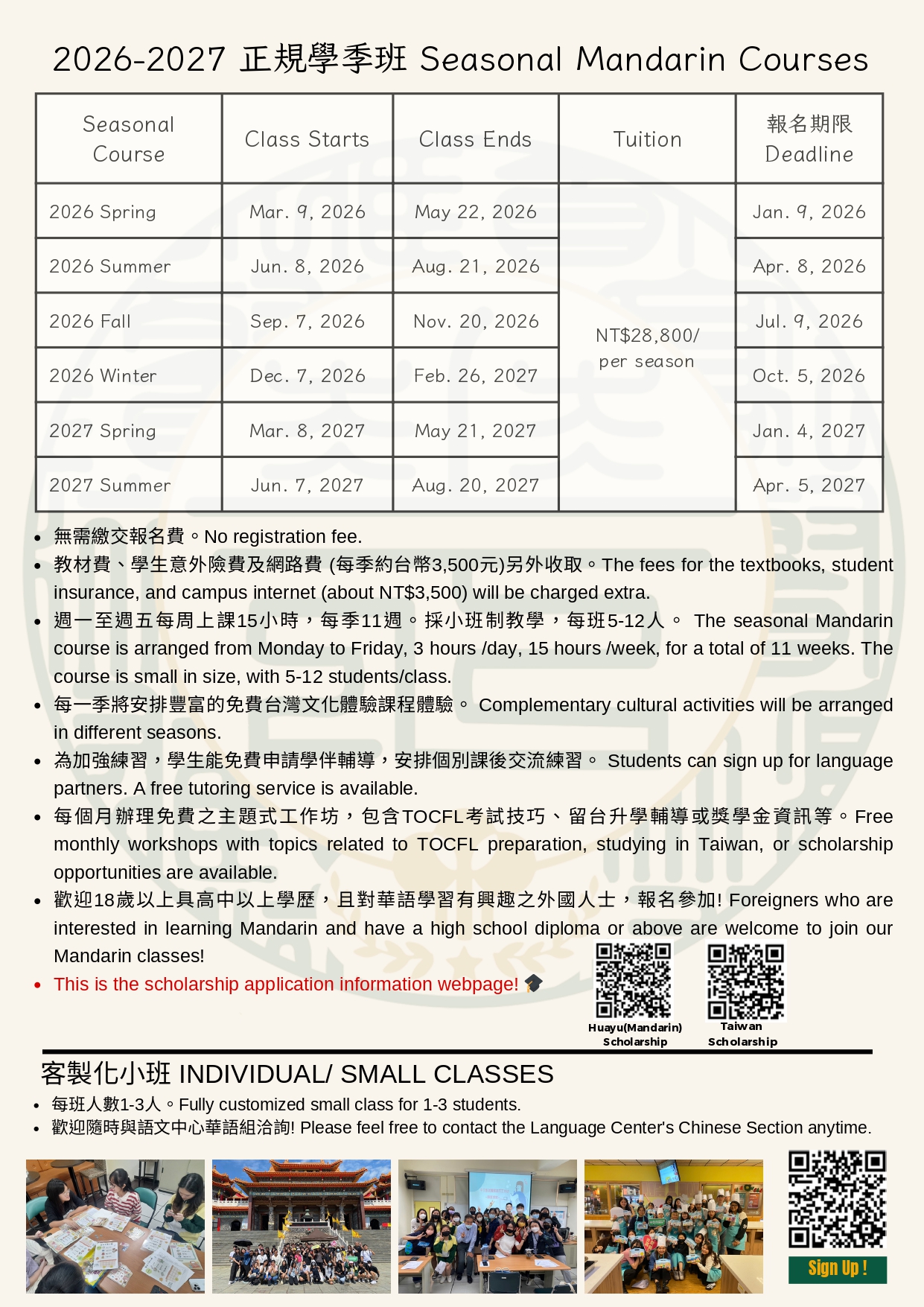 The Language Center of National Kaohsiung University of Hospitality and Tourism (NKUHT) sincerely invites international students who are interested in learning Mandarin to join our Mandarin Seasonal Program.