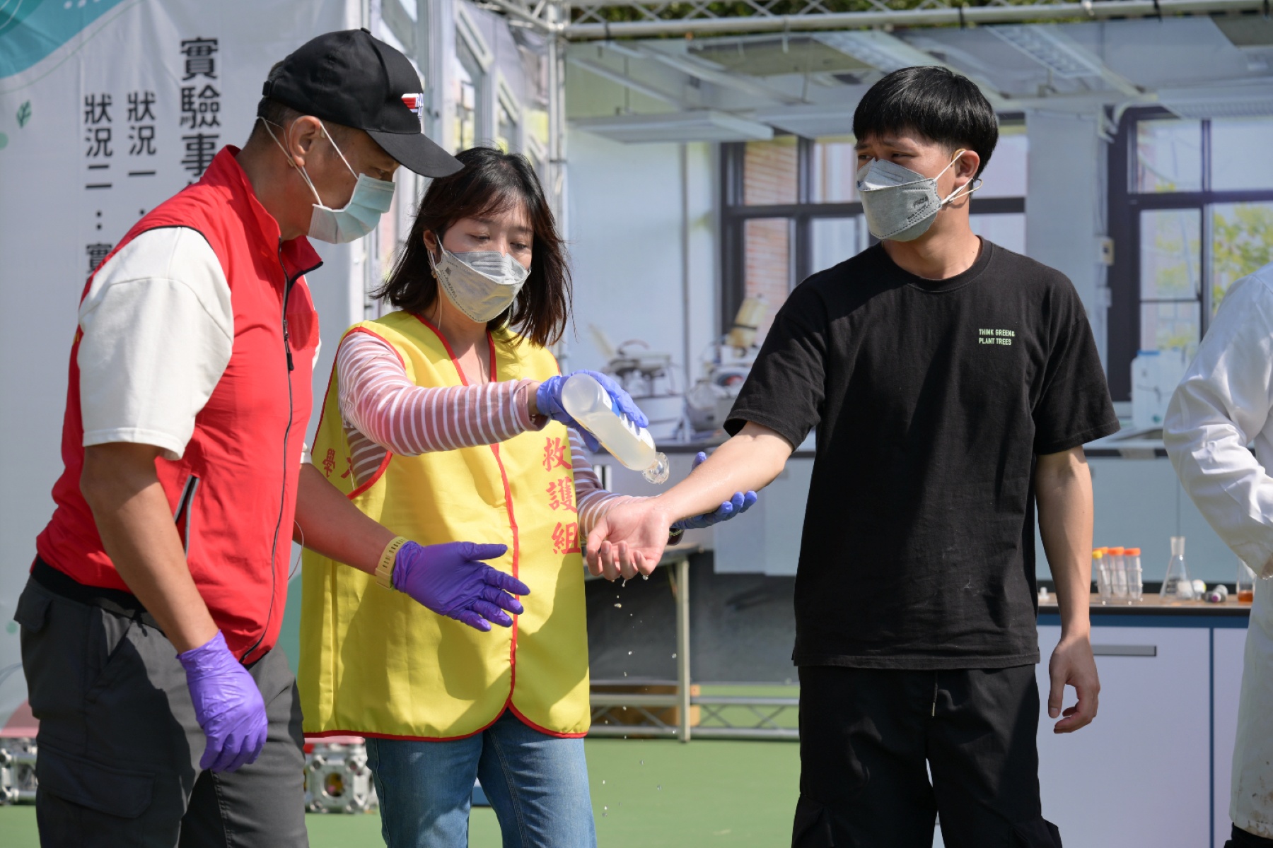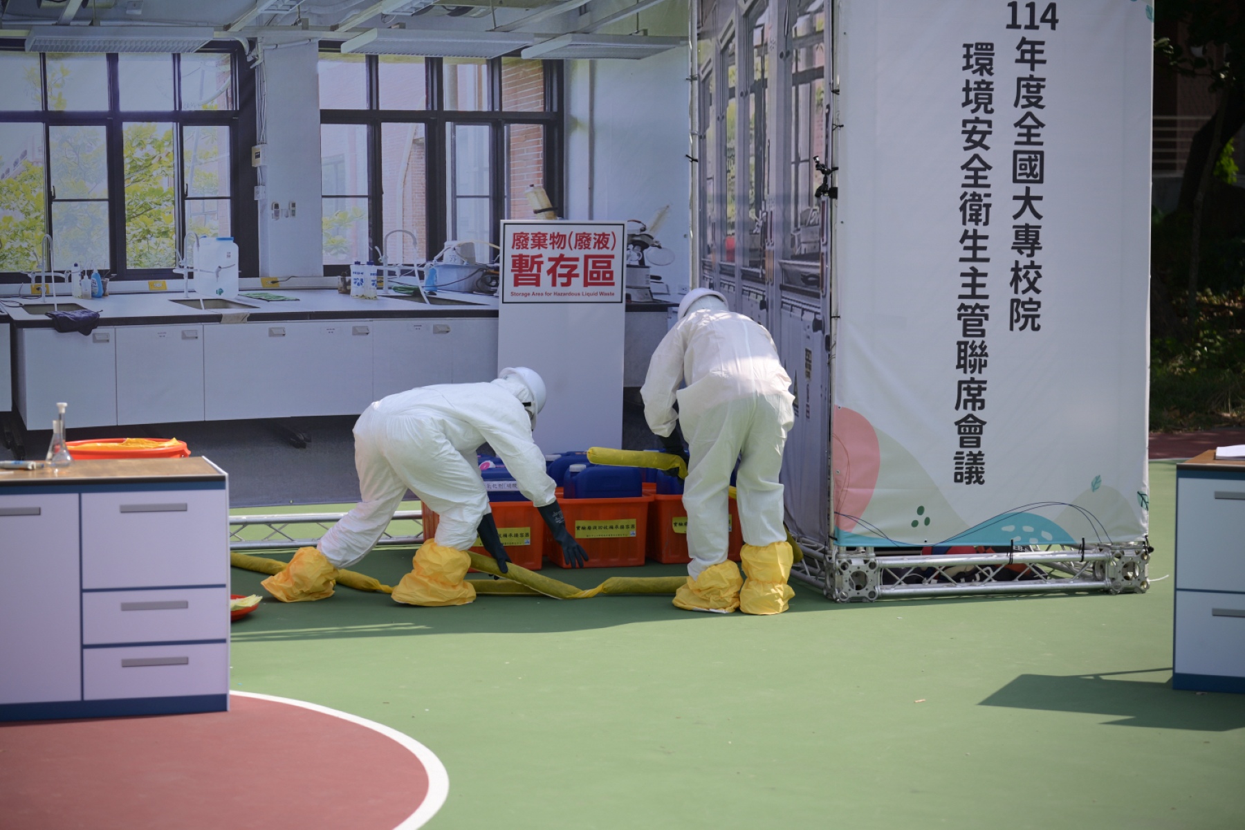 此外,會議主辦學校國立中山大學於會中規劃辦理「實驗室意外事故處理演練」,透過校園常見的「氫氟酸潑濺」、「實驗室廢液不相容」2種事故情境,來實際操演應變處理之方式,期待提升實驗室化學物質運作安全,增進校園化學事故處置與應變的能力。