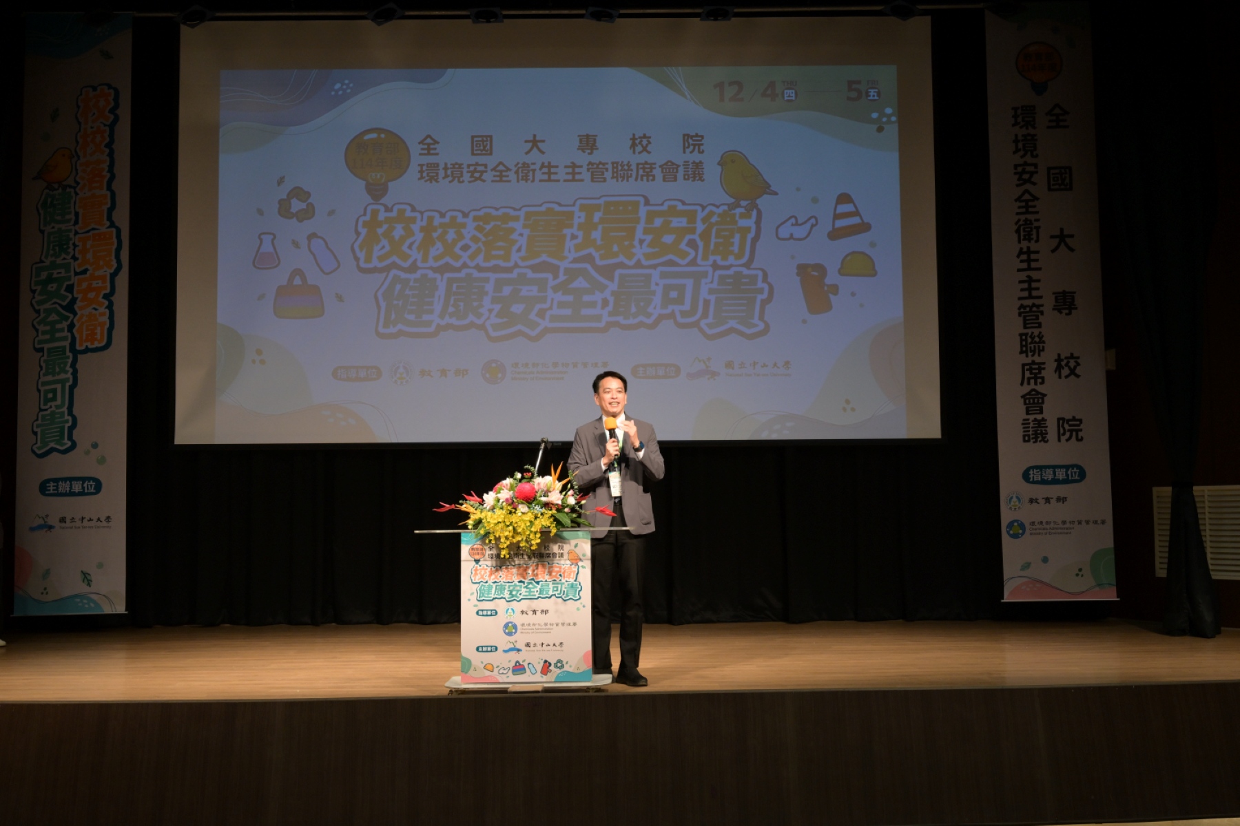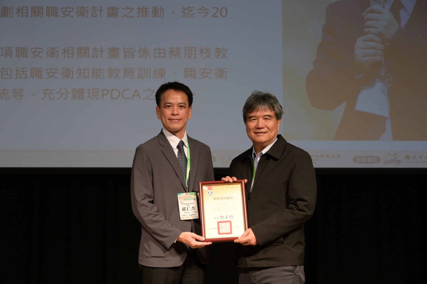 教育部於12月4日至5日在國立中山大學辦理「114年度大專校院環境安全衛生主管聯席會議」,資訊及科技教育司邱仁杰副司長表示,為了讓校園中每位教職員生都能享有身心健康的生活,每校都需要將各項環境保護、職業安全衛生的法規、政策,長期落實在實務工作中。教育部在會中特別頒發感謝狀予國立成功大學蔡朋枝特聘教授,感謝他長達27年協助規劃及推動校園職業安全衛生工作。
